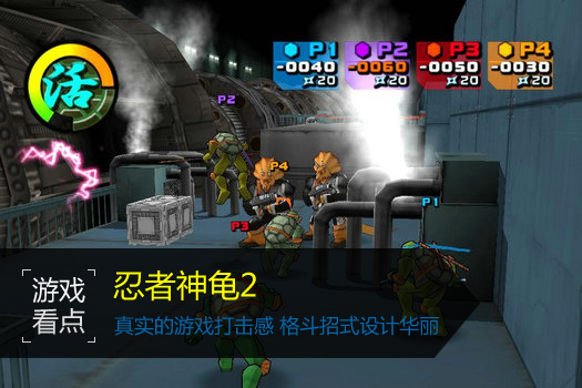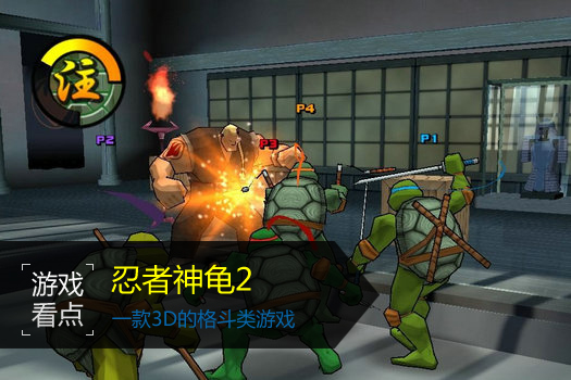 忍者神龟2并肩作战是一款3D的格斗类游戏。玩家需操纵4个忍者神龟进行战斗,最多可进行4人格斗。只需在电脑里插入键盘或游戏手柄(或下载虚拟键盘),在选人画面时就会出现4个框框,1、2、3、4P都有。其剧情与原动画片一模一样,让龟迷们过一回格斗瘾。