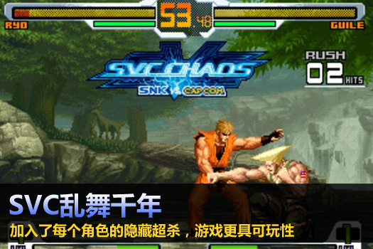 SVC乱舞千年:《SNKVSCAPCOM》 ,以SNK和CAPCOM两家街机2D格斗大厂的人物之间的大乱斗为卖点,吸收了很多高人气人物,圆了一个KOF迷和SF迷的梦。