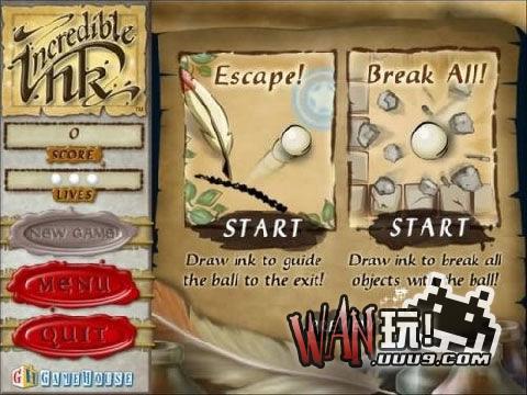 一款打砖块游戏,但是确非常有创意,通过一支小小的鹅毛笔来控制一只弹球,从而完成各种各样的任务,你所要做的就是用这支鹅毛笔在画面上划线,直线,曲线,弧线都可以,只要能挡住弹球,不然它碰到其他障碍就行了,当然速度要快,要尽量减少弹球的空行程的时间,充分利用鹅毛笔的自由划线功能。游戏分为两个模式,看着很简单,但是要在规定的时间内完成任务,就不是那么容易了。 游戏的创作者发挥的妙想天开的想象力,创造了这个游戏。这个游戏的模式也是以往打砖块游戏所没有的。想象可以让所以喜爱打砖块游戏的玩家眼前一亮。 游戏有Escape 和Break All两种游戏模式,大量的令人激动的关卡设计,配合游戏的新颖方式,高度自由的游戏方式,相信玩到此游戏的玩家会对这个砖块游戏乐此不疲。