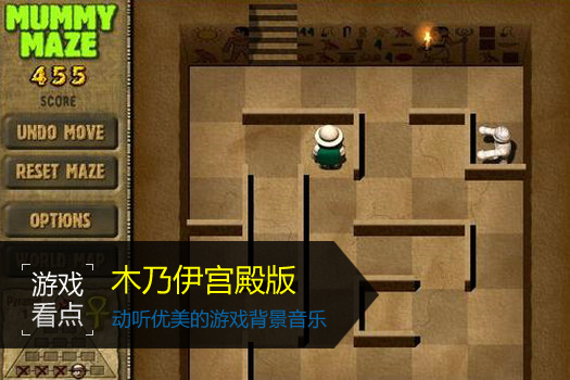木乃伊迷宫大冒险。作为敢到木乃伊地下宫殿里去探险的你,有没有跟木乃伊抓迷藏的心理准备呵!游戏在木乃伊所在的迷宫里展开,任务就是尽快赶到出口。你一次只能走一步,而木乃伊可以走两步,但木乃伊是很笨的,你可以利用障碍物牵制住木乃伊。在第二种模式中,一个金字塔为一大关,到金字塔顶部就可以获得一个宝物,打通所有的金字塔得到所有的宝物