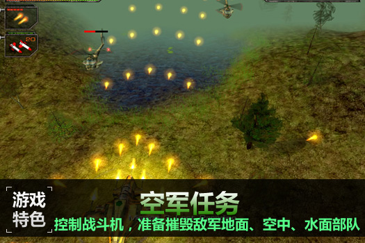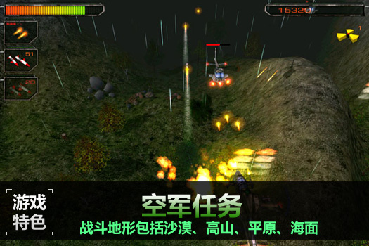 一款3D空战游戏。具备出色的画面和音效,具有水上、沙漠、山区等游戏场景。玩家的任务是摧毁地面、空中和水上的军队,袭击对象包括装甲车、重型武装直升机、潜艇、战斗机、航空母舰、战列舰等。