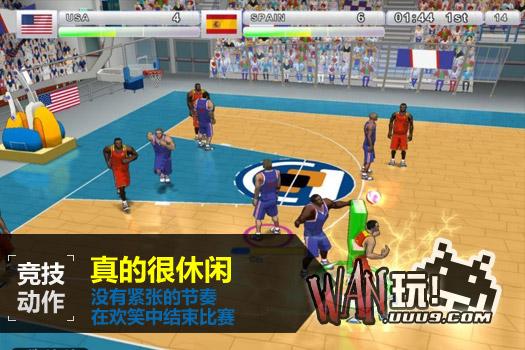 这里有你从未见过的篮球动作,比如几个队员迭罗汉、流氓式防守。卡通渲染的画面,有很多卡通道具,比如大手套等等。除了联赛外,还有三分大赛、一对一,等mini游戏。有自定义编辑器,有回放功能。